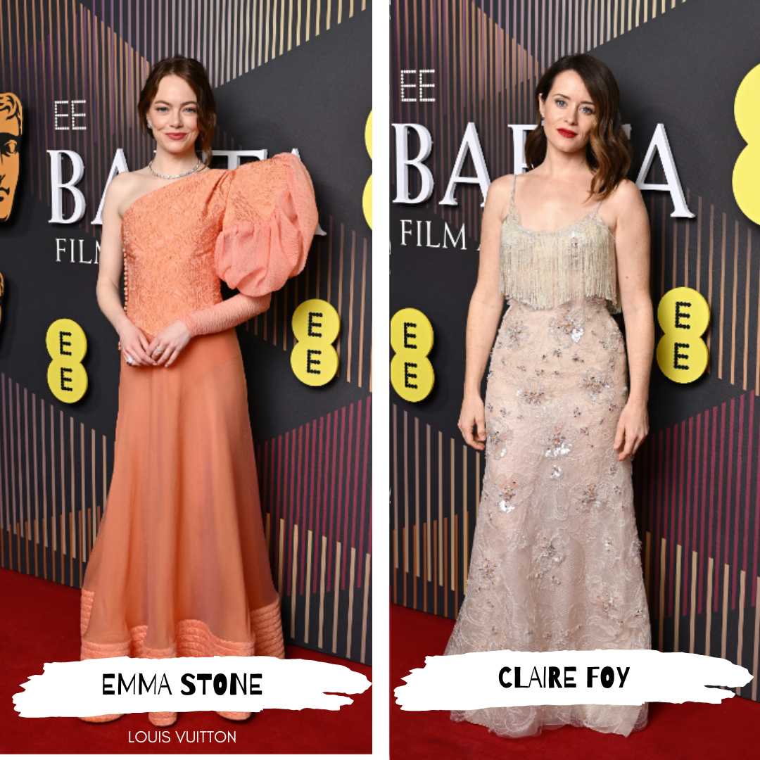 Emma Stone, che ha omaggiato il suo personaggio di Poor Things con un abito pesca con una enorme manica a sbuffo di Louis Vuitton, impreziosito da gioielli della stessa maison.