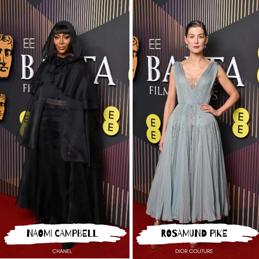 Naomi Campbell, che ha optato per un abito nero con cappuccio e volant di Chanel, dando un tocco di mistero e sofisticatezza al suo look.